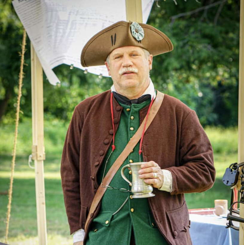 Carver also presents as the Admiral of the Blue Apron, a natural extension of the work of the Brewmeister. In Francis Grose’s A Classical Dictionary of The Vulgar Tongue, first published in 1785, he found an entry that he has adopted as the moniker for his tavern impression -- The Admiral of the Blue Apron. The ADMIRAL OF THE BLUE, is a publican wearing a blue apron, as was formerly the custom among gentlemen of that vocation. The tavern’s significance in the founding era of our nation related to another main attraction: joining comrades and sometimes opponents in political discourse and debate. He and his team provide an immersive tavern experience with tavern games, glees, stirring political debates, toasts, and of course, popular libations of the 18th Century.